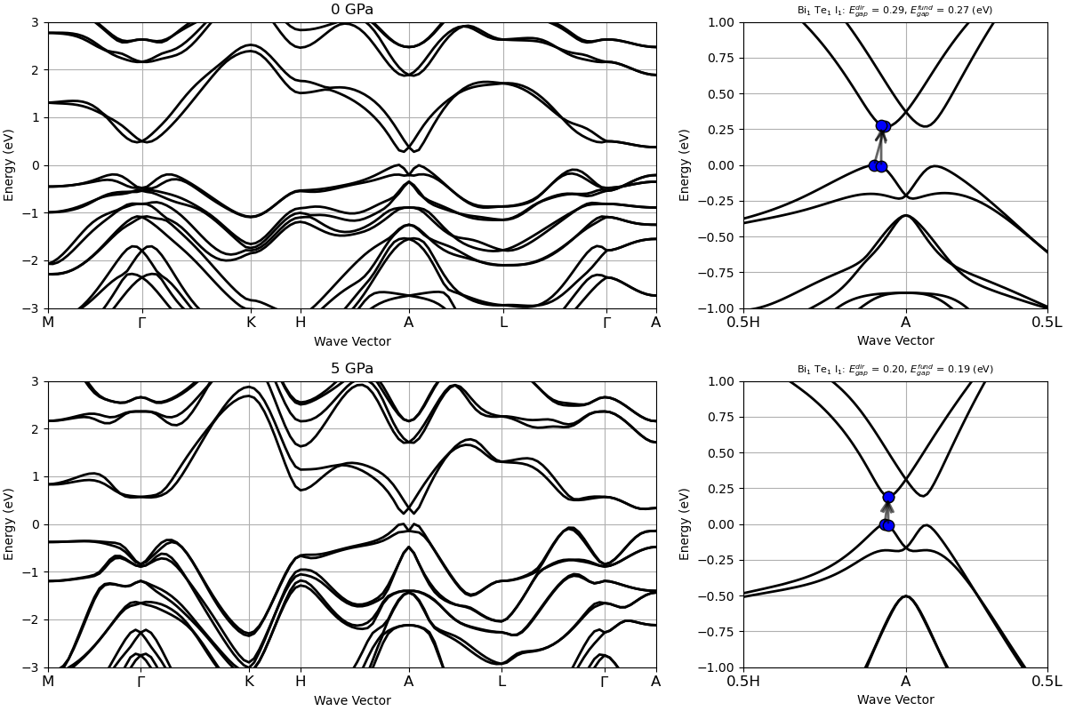 At first glance, the two figures in the right column look very similar, as they are both gapped. The band gap energy is slightly smaller at 5 GPa compared to the 0 GPa value, which seems to indicate that the band gap of BiTeI closes with increasing pressure. However, if we compute the pressure dependence of the band gap energy between these two pressures, we will observe that the band gap decreases up to P\sim 2 GPa (and almost vanishes), then starts to \textit{increase} as pressure is further increased (see Figure 4 of [Brousseau-Couture2020]). Knowing that a topological phase transition must be accompanied by a closing of the band gap, this behavior suggests that one of those pressures might have a non-trivial topology. If this is the case, the electronic bands in the non-trivial phase would display a band inversion.