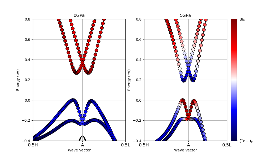 #!/usr/bin/env python from abipy.abilab import abiopen import abipy.data as abidata import matplotlib.pyplot as plt import numpy as np from mpl_toolkits.axes_grid1 import make_axes_locatable def get_projection(fb, l, typat, blist=None, fact=1.0): # This function was adapted from the plot_fatbands_typeview function e0 = fb.ebands.get_e0('fermie') x = np.arange(fb.nkpt) mybands = range(fb.ebands.mband) if blist is None else blist eigens = np.zeros((fb.nkpt, len(mybands))) width = np.zeros_like(eigens) for symbol in typat: for spin in range(fb.nsppol): wl_sbk = fb.get_wl_symbol(symbol) * (fact / 2) for ib, band in enumerate(mybands): eigens[:, ib] = fb.ebands.eigens[spin, :, band] - e0 w = wl_sbk[l, spin, band] width[:, ib] += w return eigens, width def plot_relative_projection(eigen, proj1, proj2, ax, x): # comptute relative projection and transform to [0,1] interval diff = proj1 - proj2 diff -= np.amin(diff) maxproj = np.amax(diff) diff = diff/maxproj for ib in range(np.shape(diff)[-1]): ax0 =ax.scatter(range(x), eigen[:, ib], c=diff[:, ib], marker='o', s=80, cmap='seismic', edgecolor='k', zorder=2, vmin=0, vmax=1) return ax0 flist = ["tz2_2o_DS13_FATBANDS.nc", "tz2_2o_DS23_FATBANDS.nc"] title = ['0GPa', '5GPa'] bands = [np.arange(36,40), np.arange(36,40)] fig, ax = plt.subplots(1, len(flist), figsize=(5*len(flist), 6)) for j in range(len(flist)): # plot electronic bands data = abiopen(flist[j]) data.ebands.set_fermie_to_vbm() data.ebands.plot(with_gaps=False, ylims=(-0.4, 0.8), ax=ax[j], show=False, fontsize=16, zorder=1) # compute Bi-p projections bi_eigen, bi_proj = get_projection(data, l=1, typat=['Bi'], blist=bands[j]) # compute the sum of Te-p and I-p projections tei_eigen, tei_proj = get_projection(data, l=1, typat=['Te', 'I'], blist=bands[j]) # compute and plot relative projection relplot = plot_relative_projection(bi_eigen, bi_proj, tei_proj, x=data.nkpt, ax=ax[j]) ax[j].set_title(title[j]) ax[j].set_xticks([0, 17, data.nkpt-1]) ax[j].set_xticklabels(['0.5H', 'A', '0.5L'], fontsize=12) divider = make_axes_locatable(ax[1]) cax = divider.append_axes("right", size="7%", pad=0.15) cbar = plt.colorbar(relplot, cax=cax, ticks=[0, 1]) cbar.ax.set_yticklabels(['(Te+I)$_p$', 'Bi$_p$']) plt.savefig('tz2_2_relative_projection.png') plt.show()
