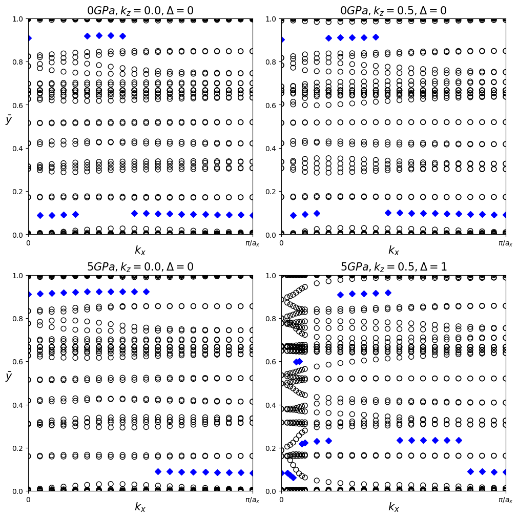 To calculate this invariant on a coarse k-mesh, we consider the points marking the middle of the largest gap at each \(k_x\) value rather than a horizontal line. These points are marked by blue diamonds above. Whenever the location of the middle of the gap changes between two adjacent \(k_x\) values, we count the number of HWCC that exist between the two gap centers and sum this number for all the crossings as \(k_x\) goes from 0 to \(\pi/a_x\). If this value is even, \(\Delta=0\), and if it is odd, \(\Delta=1\). Performing this counting procedure for both \(k_z\) planes produces \(\Delta=0\) for each case besides \(k_z=0.5\) with \(P=5\) GPa, indicating that the 0 Gpa phase is trivial and the 5 GPa phase is topological.